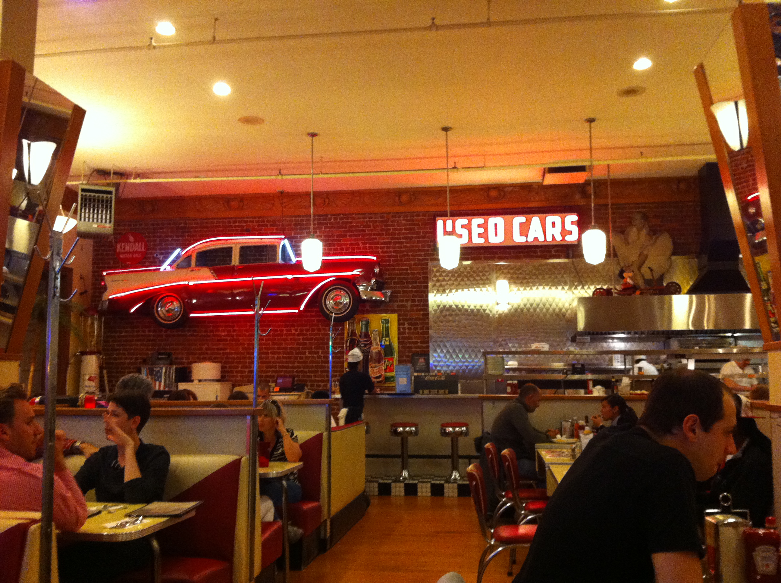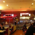 A 1 ou 2 rues, il y’a le Lori’s Diner. Enfin un des nombreux Lori’s Diner. En fait c’est une chaine, il y’en a pas mal, on s’en est aperçu par la suite. Mais celui-ci était bien grand, d’autres tout petits, bref, ils n’ont pas forcément tous la même tronche. Niveau déco, ça se veut le diner « typique » des années 50′s.
