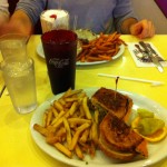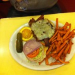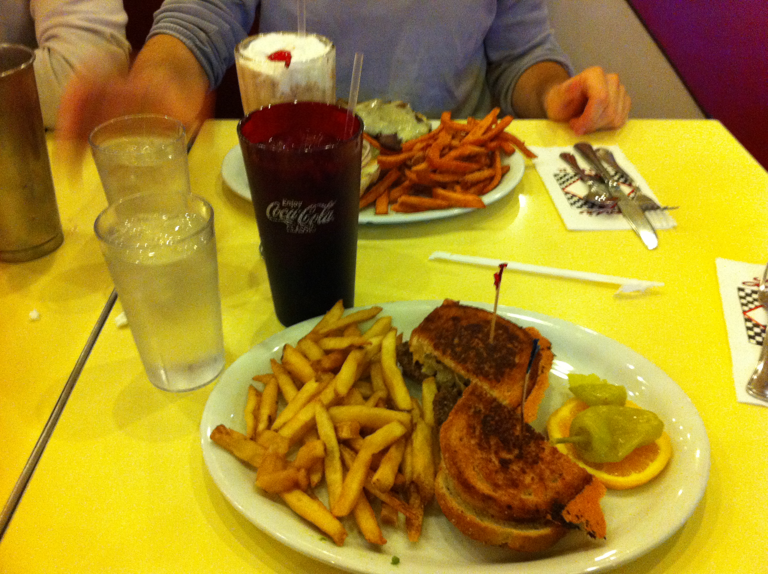 Le premier burger, c’était celui de Jo. Ca se rapprochait plus du croque monsieur apparemment. On peut voir un bout du milk shake. Le burger ouvert en 2 où on à l’impression qu’un type a gerbé dedans, c’était le mien, le spécial Lori. Avec des frites de pomme de terre douce. Faut pas se fier à l’aspect. Le reste, c’est la déco. J’étais pas là dans les 50′s mais on sent que les mecs font un effort.